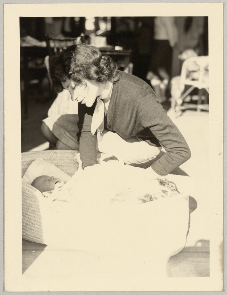 Christine Picasso observant son fils Bernard dans un couffin à La Californie, Cannes, en [1959]