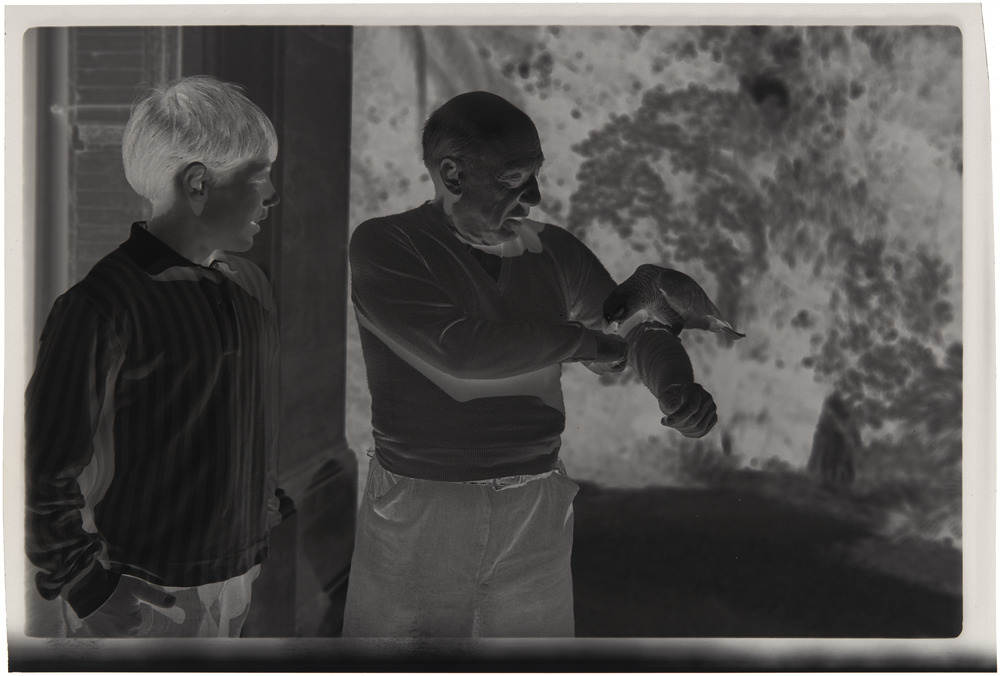 Claude et Pablo Picasso avec un perroquet posé sur son bras sur le perron de La Californie, Cannes, en [1960]