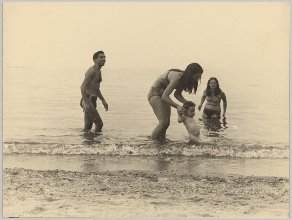 Claude Picasso apprenant à marcher avec Françoise Gilot dans l'eau, aux côtés de Vilató Ruiz et Matsi Hatzilazarou, plage de Golfe-Juan, en 1948