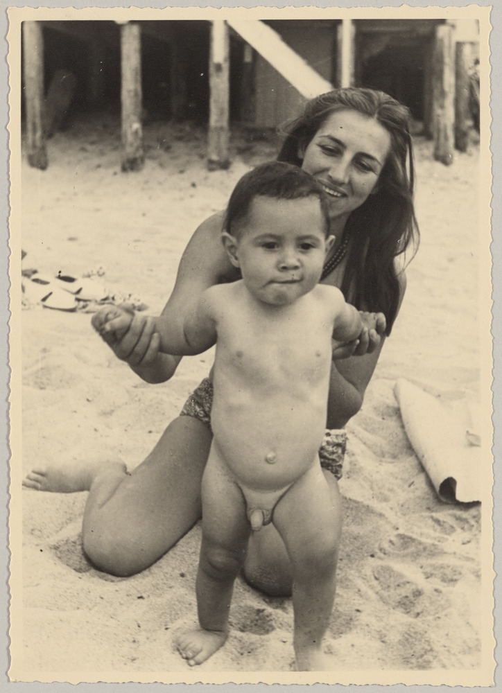 Claude Picasso apprenant à marcher avec Françoise Gilot sur la plage à Golfe-Juan, en 1948