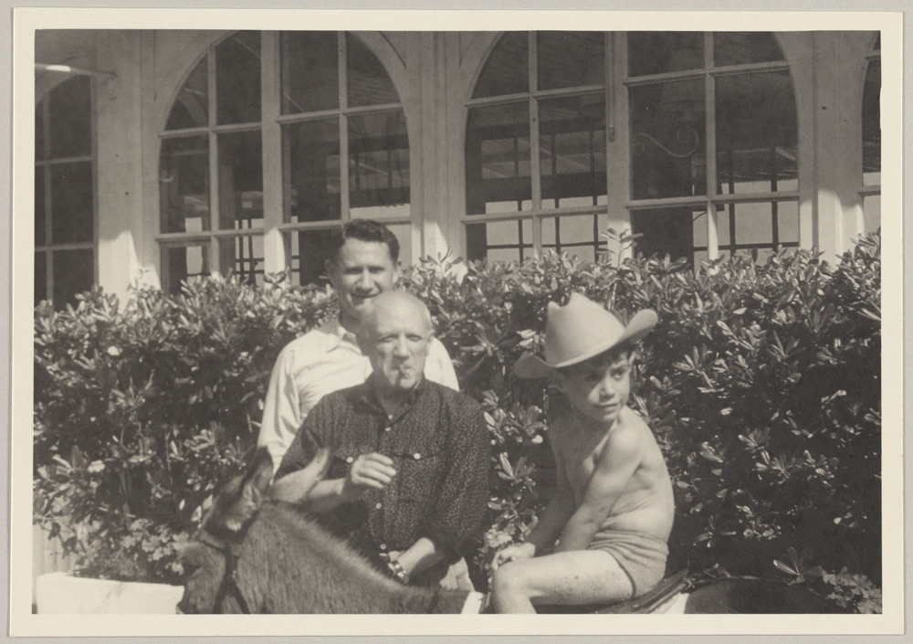 Claude Picasso sur un âne, Pablo Picasso et Channing Peake devant le restaurant Tetou, Golfe-Juan, en 1953