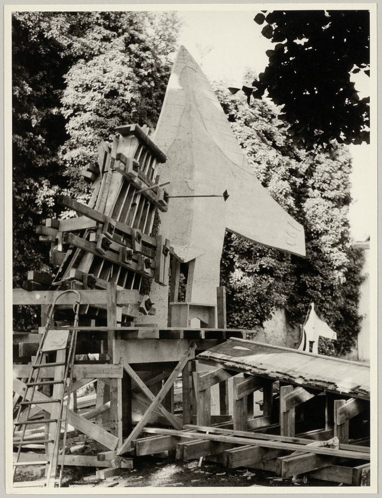 Coffrage du bras de la sculpture "Femme aux bras écartés" à côté de la maquette intermédiaire, prieuré St-Hilaire, Chalo-Saint-Marne, en 1962