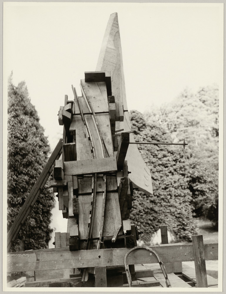 Coffrage du bras de la sculpture "Femme aux bras écartés", prieuré St-Hilaire, Chalo-Saint-Mars, en 1962