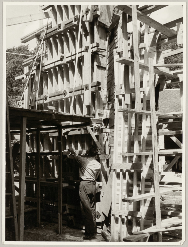 Coffrage pour la sculpture de la "Femme aux bras écartés", parc du prieuré de Saint-Hilaire, Chalo-Saint-Mars, en 1962