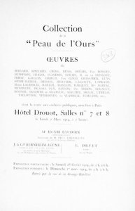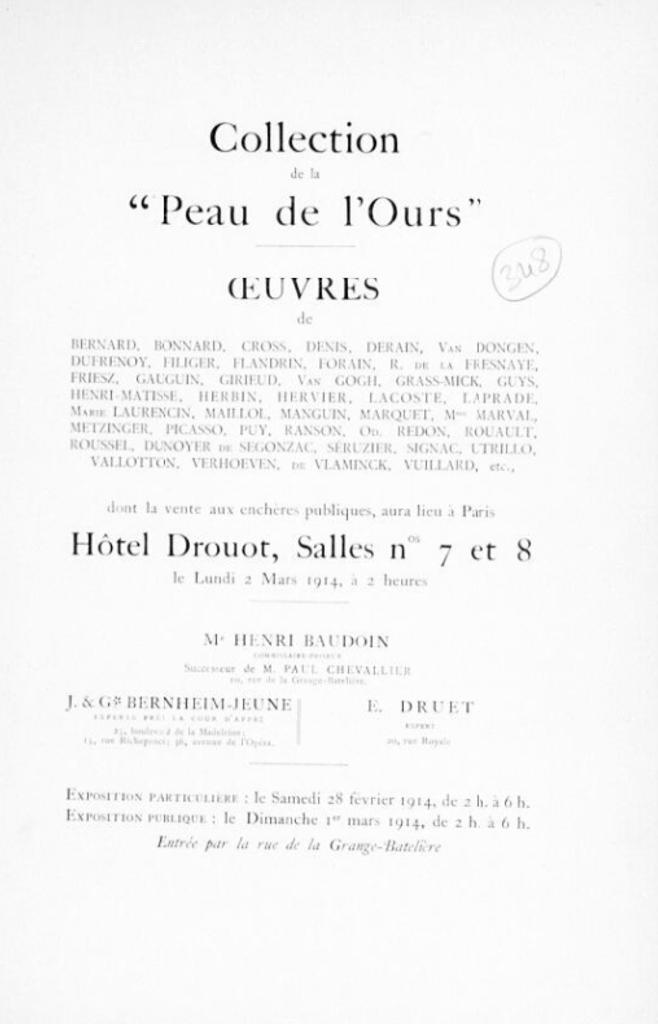 Collection de la "Peau de l'Ours", œuvres de Bernard, Bonnard, Cross, Denis, Derain, Van Dongen, Dufrenoy, Filiger, Flandrin, Forain, R. de la Fresnaye, Friesz, Gauguin, Girieud, Van Gogh, Grass-Mick, Guys, Henri-Matisse, Herbin, Hervier, Lacoste, Laprade, Marie Laurencin, Maillol, Manguin, Marquet, Mme Marval, Metzinger, Picasso, Puy, Ranson, Od[ilon] Redon, Rouault, Roussel, Dunoyer de Segonzac, Séruzier [sic], Signac, Utrillo, Vallotton, Verhoeven, de Vlaminck, Vuillard, etc..., Paris, Hôtel Drouot, Lundi 2 mars 1914 à 2 heures