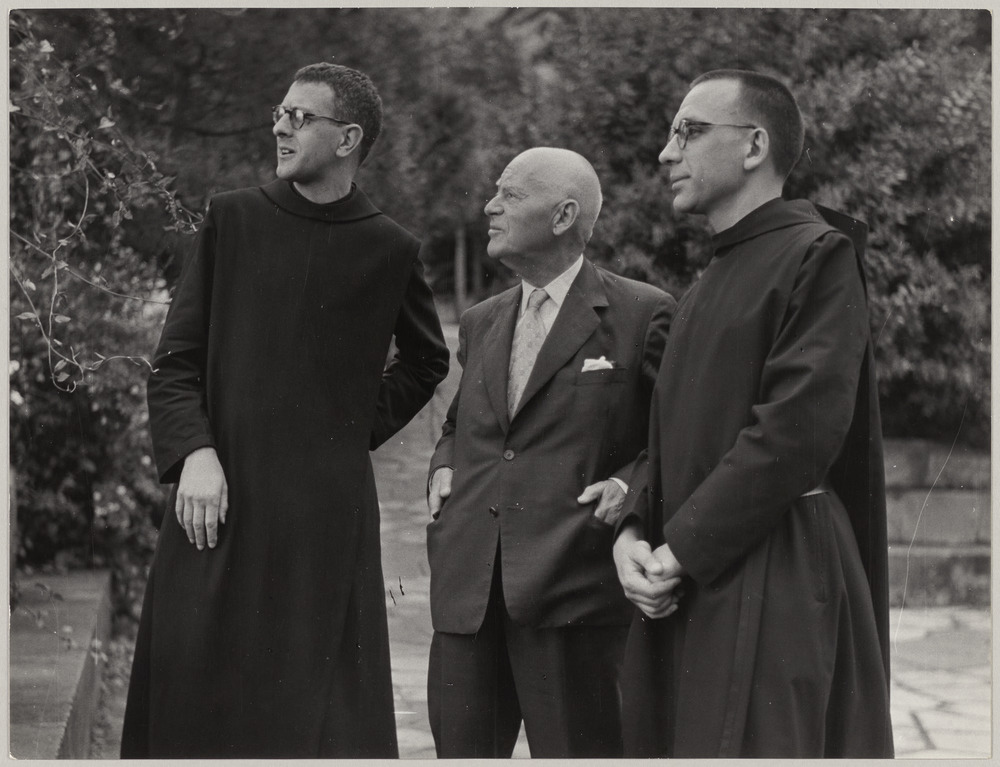 Daniel-Henry Kahnweiler et deux religieux dans un jardin, en Espagne, vers 1961