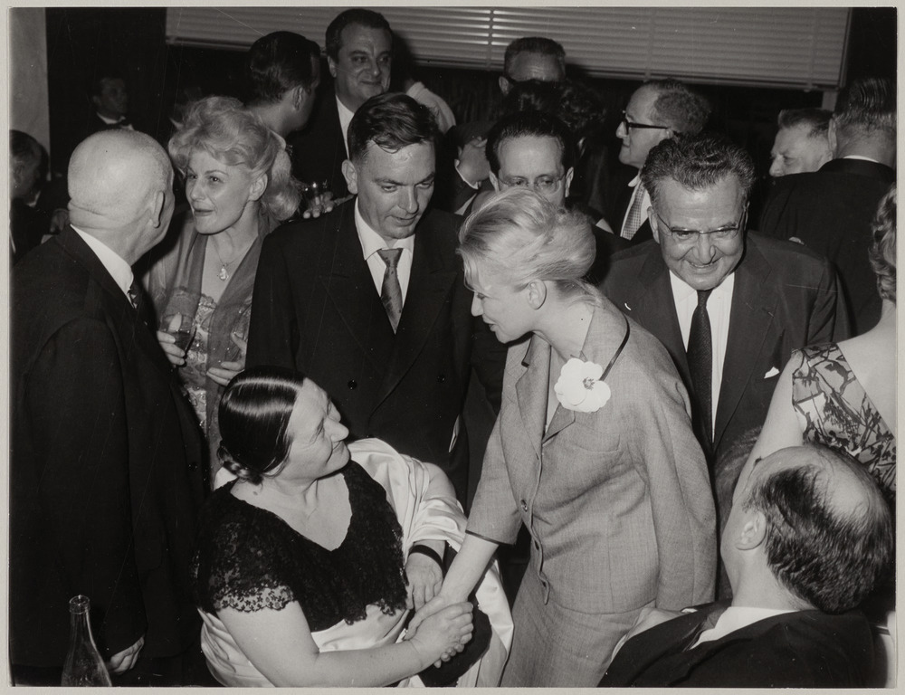 Daniel-Henry Kahnweiler et Nadia Léger entourés d'autres personnes lors de l'inauguration du Musée Fernand Léger à Biot, le 13 mai 1960