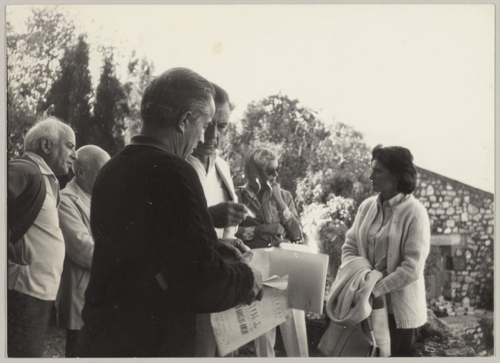 David Douglas Duncan et Gary Cooper discutant, au second plan, Sheila Duncan, Veronica Cooper, Jacques Couëlle et Pablo Picasso dans le jardin de Castellaras-le-Vieux, Mouans-Sartoux, en 1960