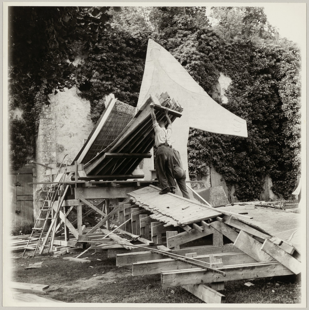 Décoffrage du bras de la sculpture "Femme aux bras écartés", prieuré St-Hilaire, Chalo-Saint-Mars, en août 1962