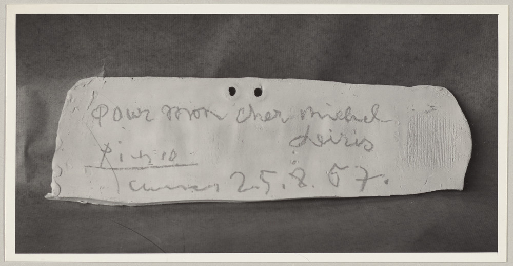 Dédicace originale gravée à la roulette sur terre cuite "Pour mon cher Michel Leiris. Cannes. 25 août 1957"