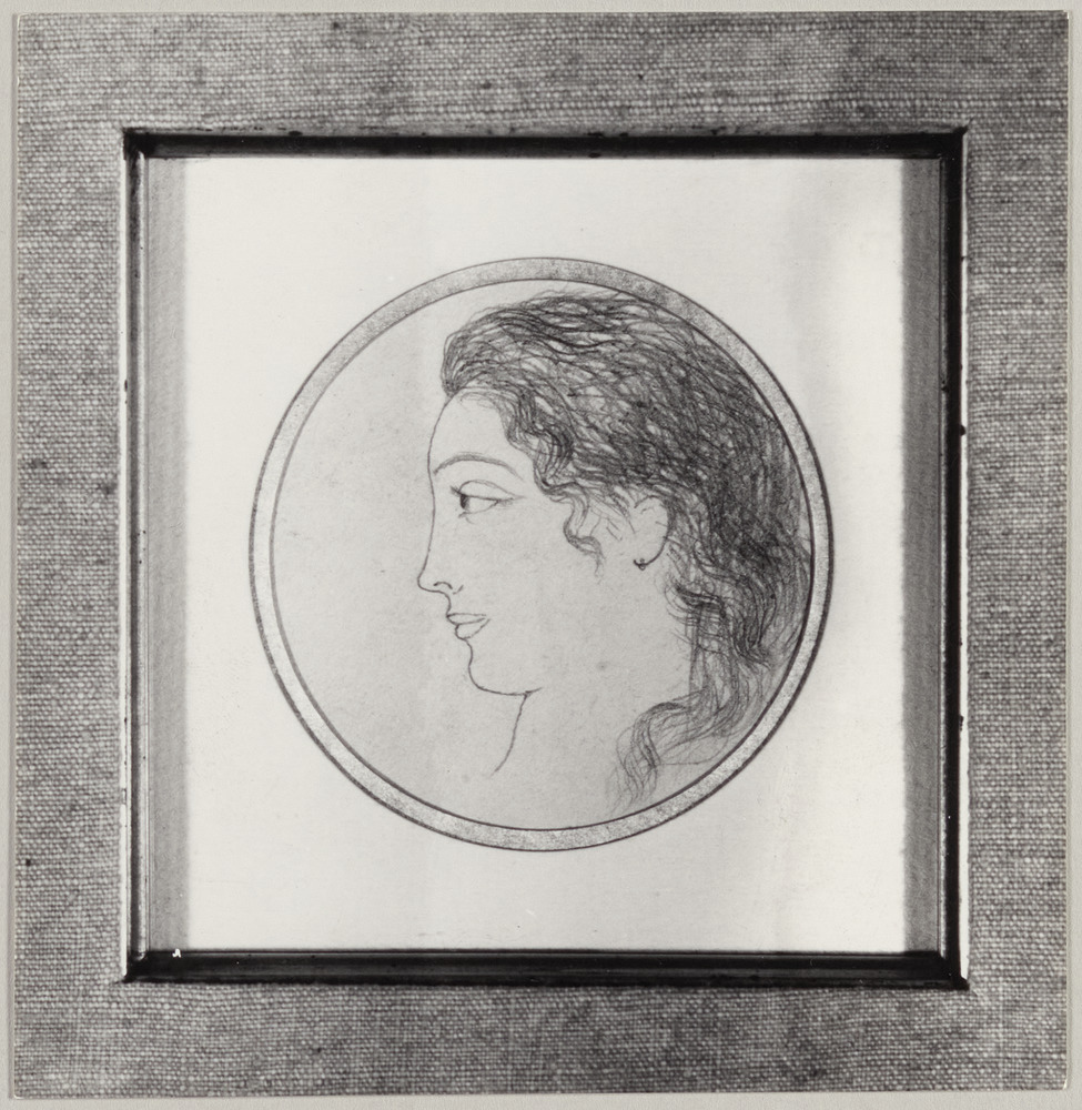 Dessin au crayon, "Portrait de Gaby de Lespinasse de profil" dans un médaillon
