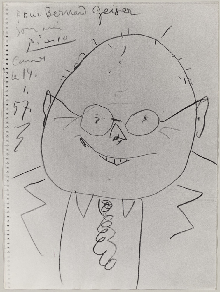 Dessin au crayon "Portrait d'homme [Bernard Geiser]", Cannes, 14 janvier 1957 et dédicacé à Bernard Geiser, 1957