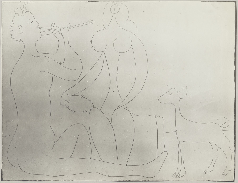 Dessin à la mine de plomb "Faune à la flûte, femme nue au tambourin et chevreau" V, Antibes, 31 octobre 1946