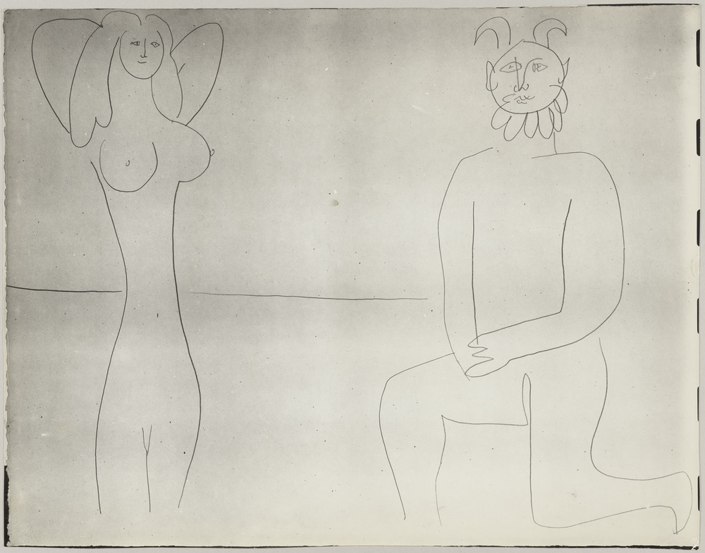 Dessin à la mine de plomb [Femme et faune barbu], [Antibes, 1946]