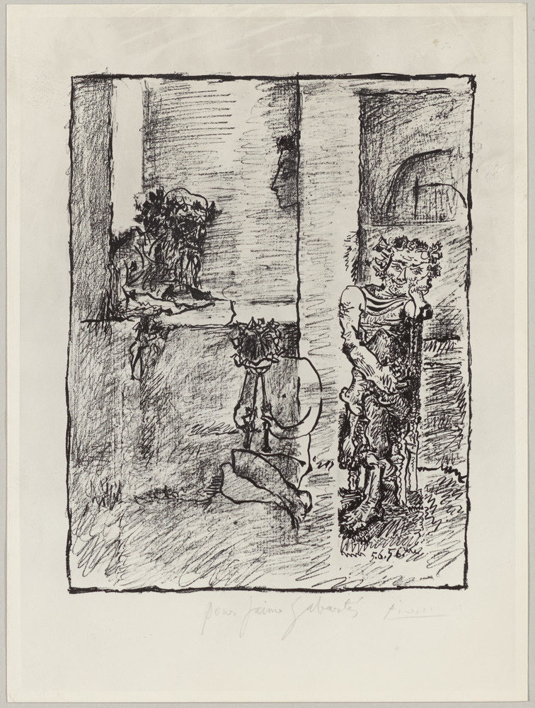 Dessin à l'encre de chine et crayon "Trois hommes", 5 juin 1956 et dédicacé à J. Sabartés