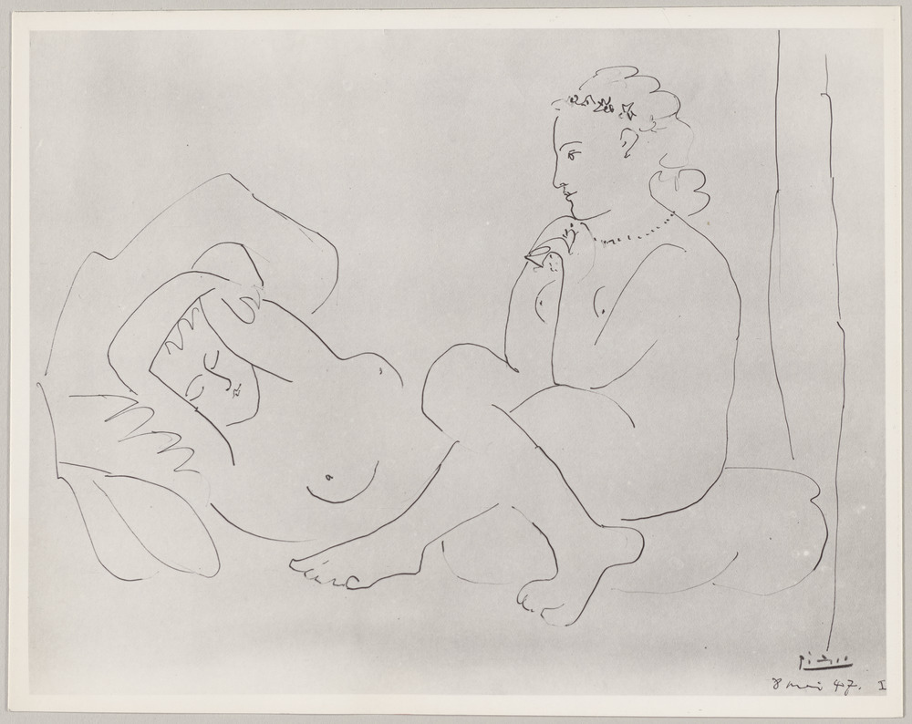 Dessin à l'encre de chine "Femme endormie et femme accroupie", 8 mai 1947