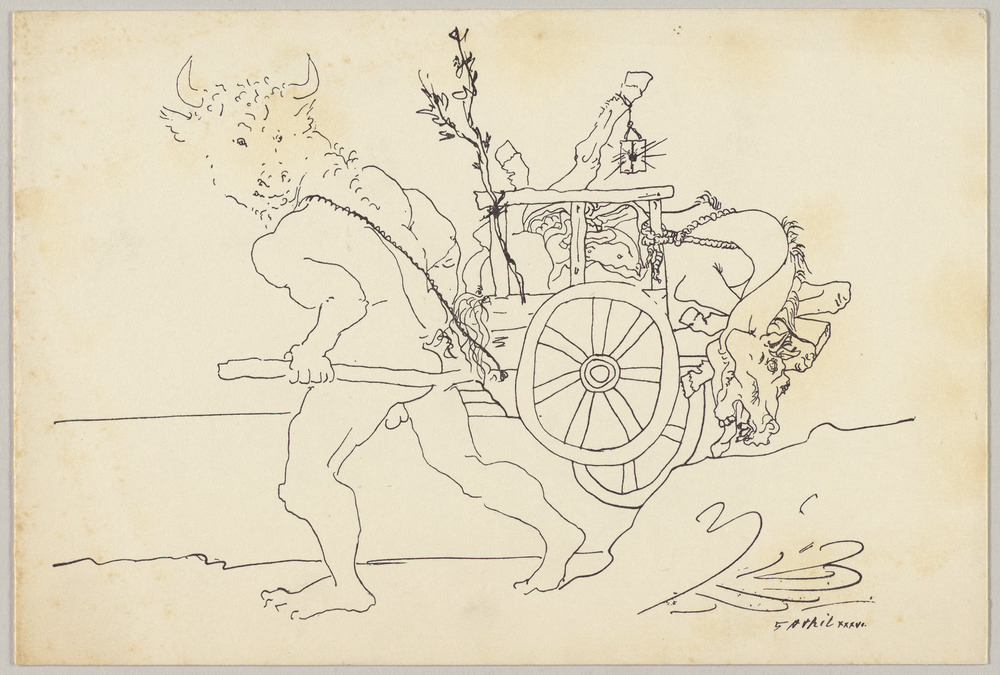 Dessin à l'encre de chine "Un Minotaure emmenant une jument et son poulain dans une charrette", Juan-les-Pins, du 5 avril 1936