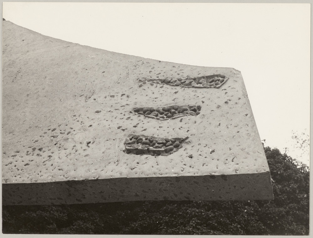 Détail de la main de la sculpture "Femme aux bras écartés", prieuré St-Hilaire, Chalo-Saint-Mars, en 1962