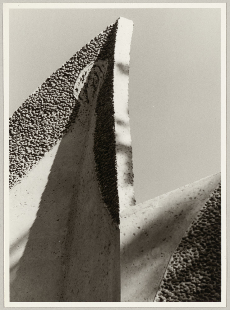 Détail de la tête vue de dos de la sculpture en bétogravure "Femme aux bras écartés", prieuré St-Hilaire, Chalo-Saint-Mars, en 1962