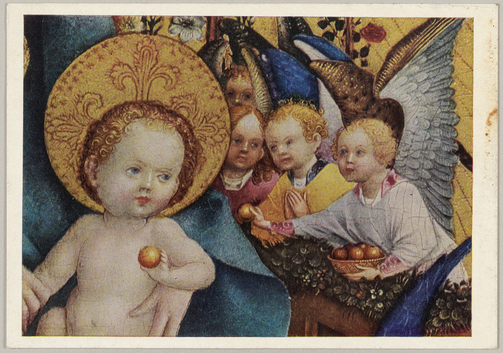 Détail de l'Enfant Jésus et des anges tiré du panneau "Madone au buisson de roses" de Stefan Lochner, Wallraf-Richartz Museum de Cologne