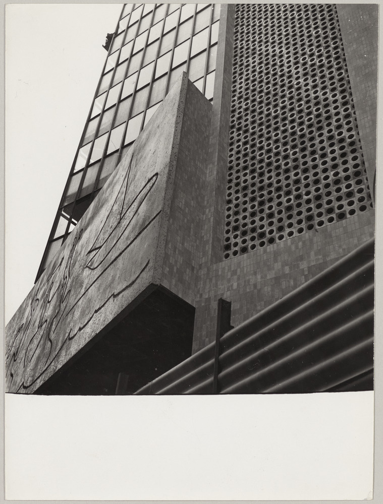 Détail d'une des frises bétogravées de Carl Nesjar d'après des dessins de Pablo Picasso édifiées sur la façade du Collège des architectes de Catalogne en travaux, à Barcelone