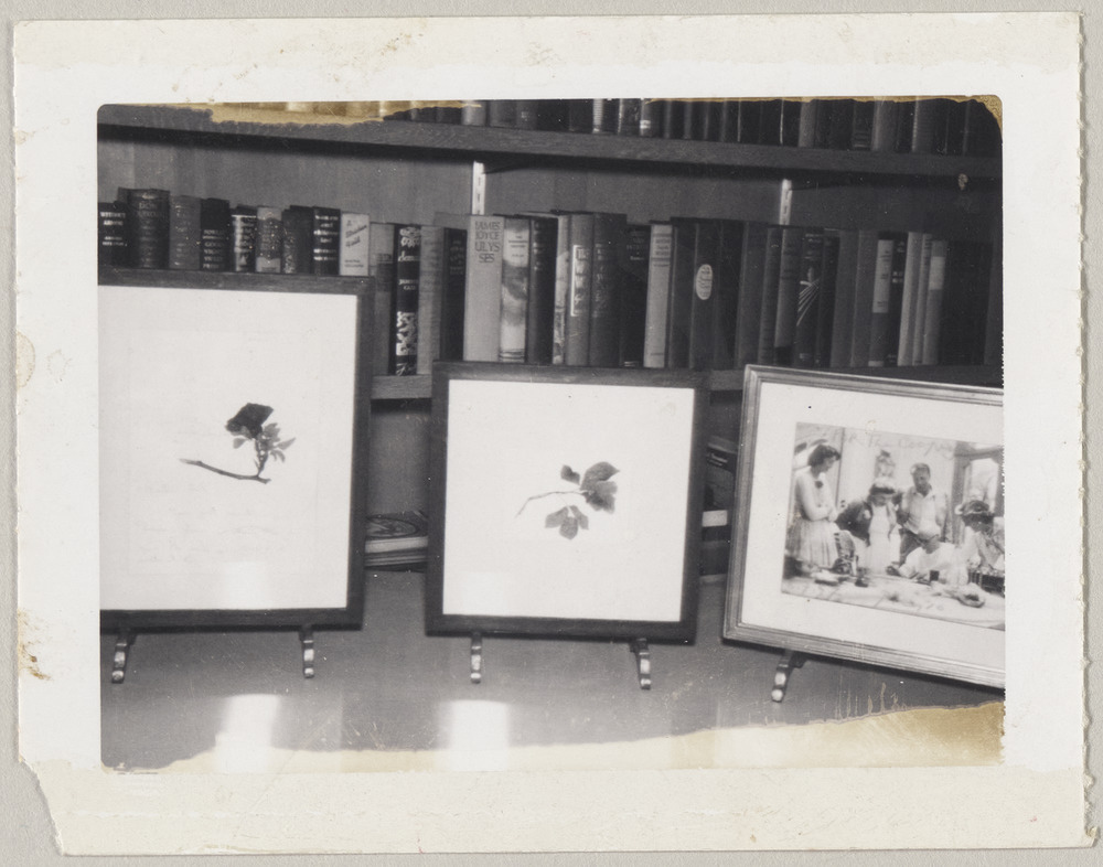 Deux cadres avec des fleurs et un cadre avec une photographie d'un groupe autour de Picasso posés sur un téléviseur, devant une bibliothèque