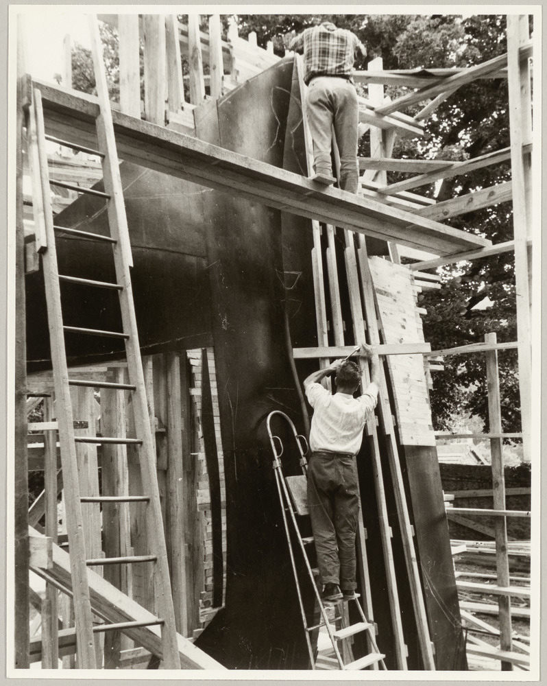 Deux hommes travaillant au coffrage pour la sculpture "Femme aux bras écartés", parc du prieuré de Saint-Hilaire, Chalo-Saint-Mars, en 1962