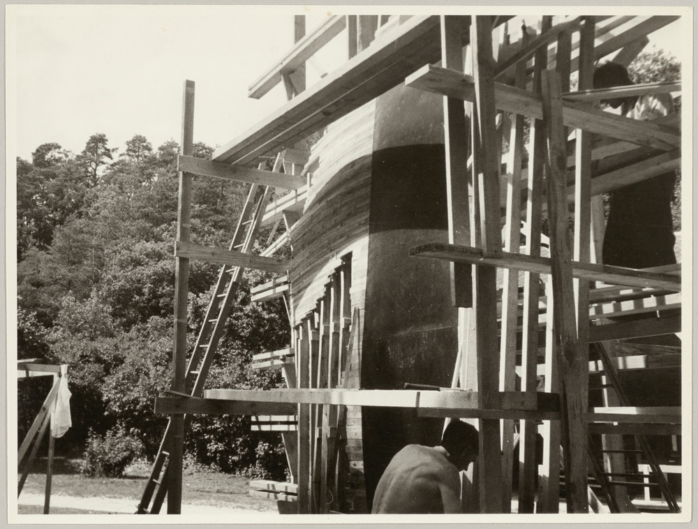 Deux hommes travaillant au coffrage pour la sculpture "Femme aux bras écartés", parc du prieuré de Saint-Hilaire, Chalo-Saint-Mars, en 1962