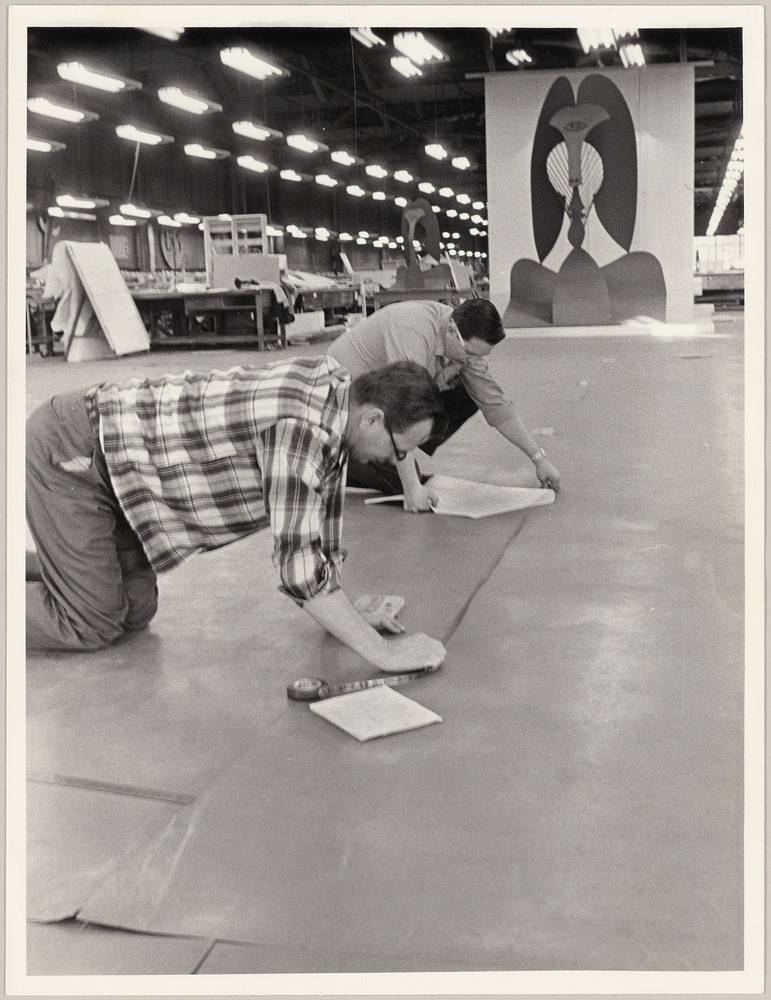 Deux ingénieurs faisant des calculs pour la future sculpture monumentale "Tête" du Chicago Civic Center (Daley plaza) dans l'atelier de l'American Bridge Company, Gary, Indiana, en 1966-67
