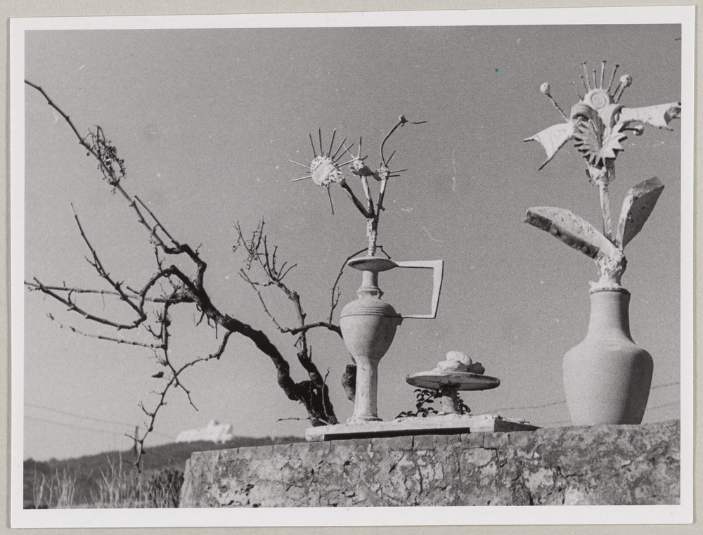 Deux plâtres "Nature morte au bouquet de fleurs" et "L'arrosoir fleuri" posés sur un muret de la cour de l'atelier du Fournas, Vallauris, en [1951]