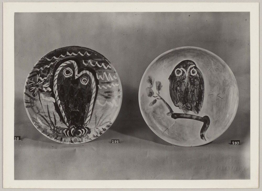 Deux plats rectangulaires en céramique décorés de chouettes, dans l'atelier Madoura, Vallauris, en 1948