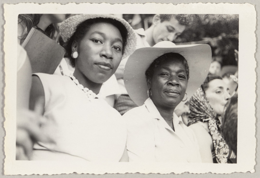 Deux spectatrices à côté de Jacqueline Roque à la corrida de Vallauris, en août 1955