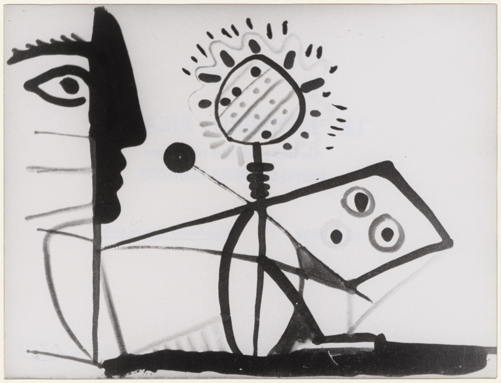Deuxième état du dessin "Profil féminin et scène de plage" sur le plateau du "Mystère Picasso" de Henri-Georges Clouzot, studio de La Victorine, Nice, en 1955
