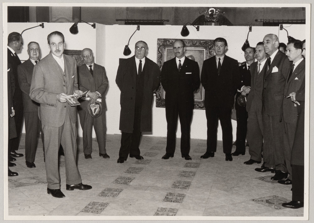 Discours du critique d'art Joan David avec Joan Vidal Ventosa, Jaime Sabartés, Josep Maria Marcet, Miquel Gaspar, Paul Picasso et Joan Ainaud de Lasarte à l'inauguration de l'exposition "Picasso" au Musée de Sabadell, le 6 janvier 1960