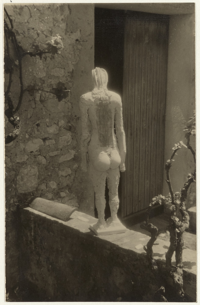 Dos de la sculpture en plâtre "Femme enceinte" sur un muret de la cour de l'atelier du Fournas, Vallauris, le 06 mai 1950