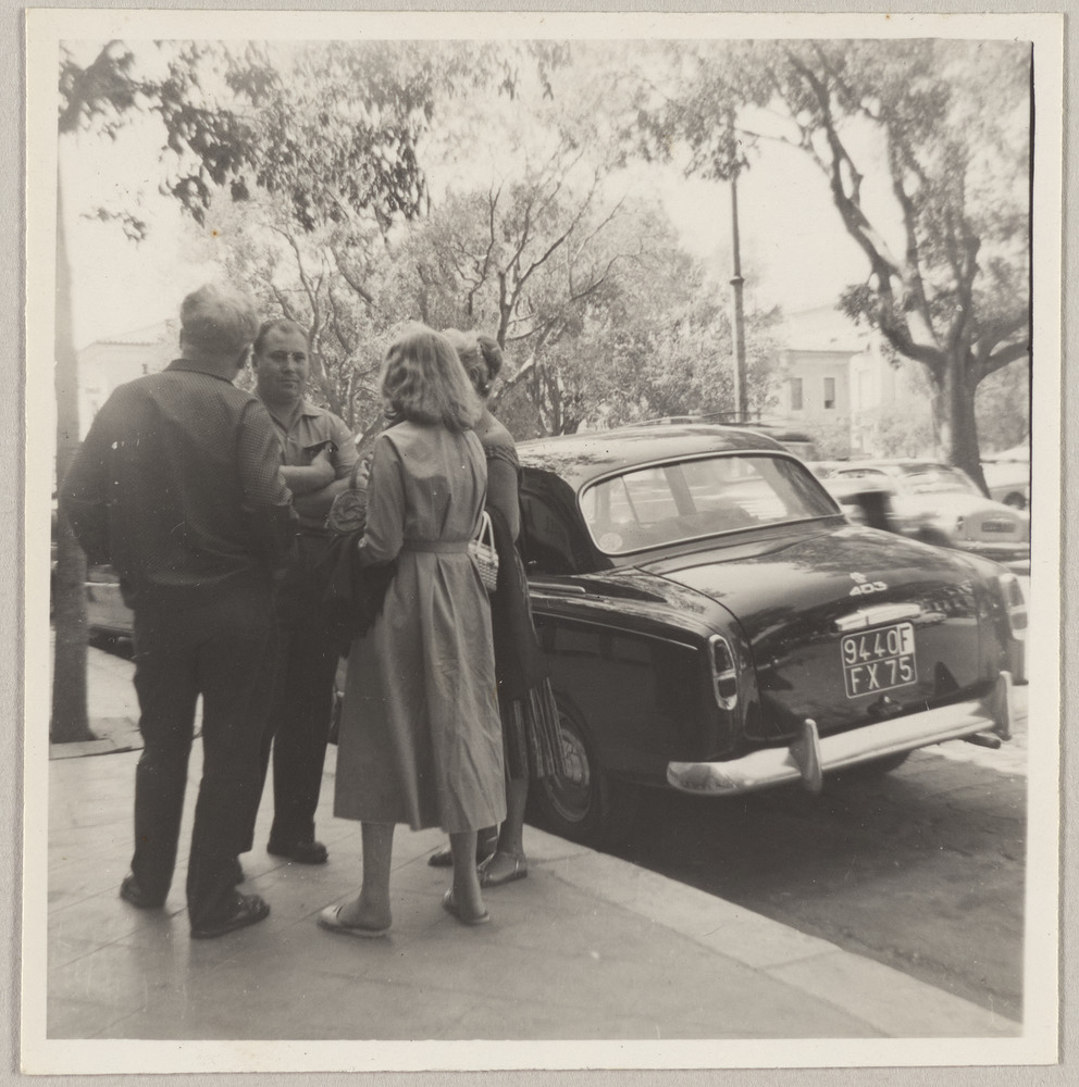 Édouard Pignon et Hélène Parmelin discutant avec deux amis dans une rue de Cannes, dans les années 1950