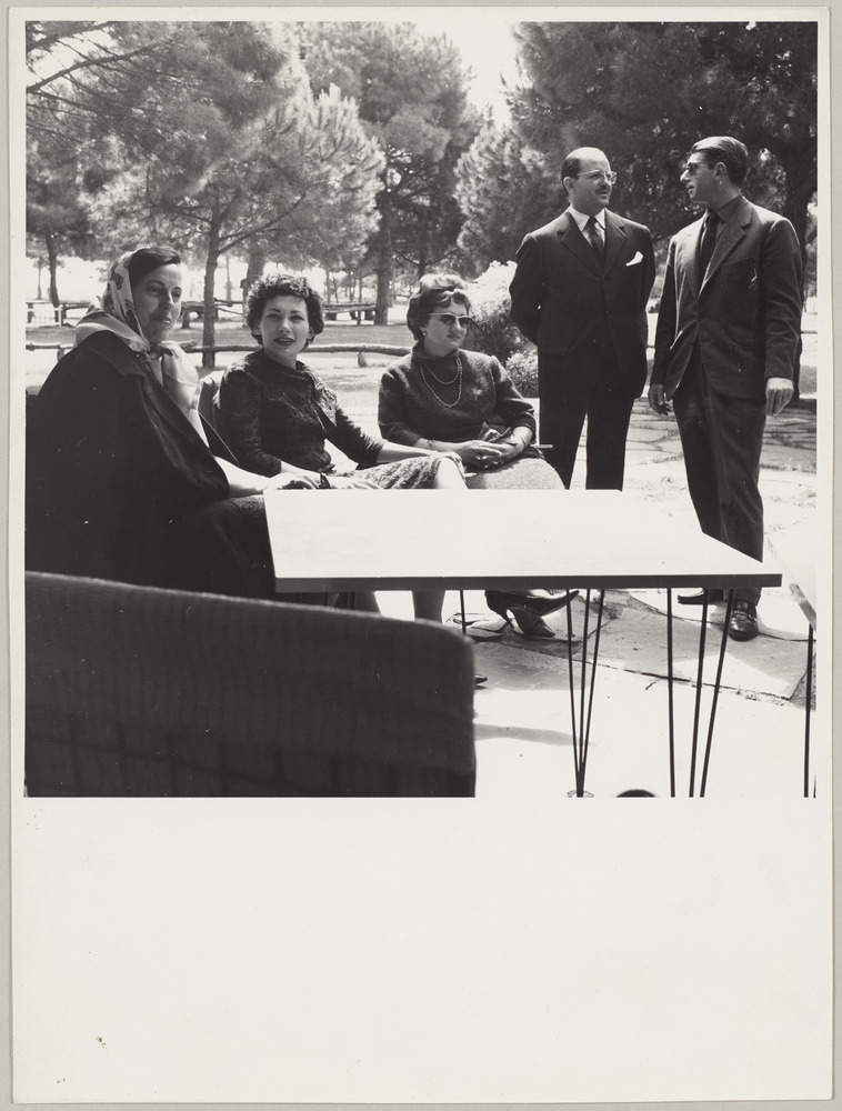 Elvira Farreras Gaspar, Christine Picasso, Filomena Alba Gaspar, Paul Picasso et Joan Gaspar à la terrasse d'un café, début années 1960