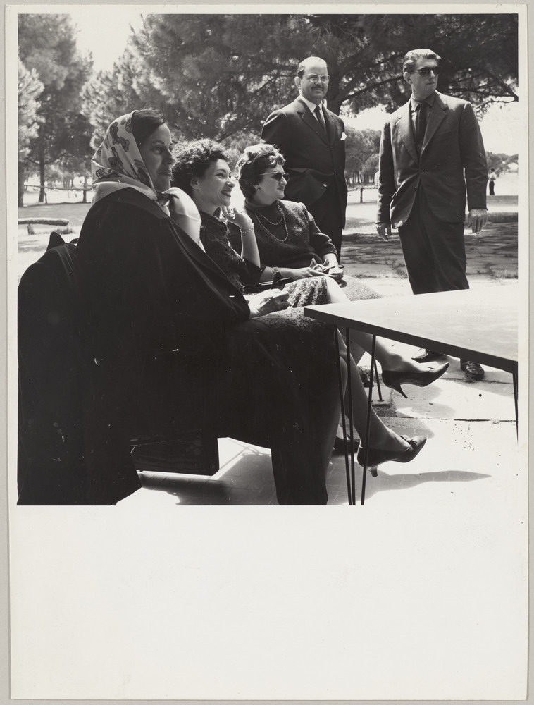 Elvira Farreras Gaspar, Christine Picasso, Filomena Alba Gaspar, Paul Picasso et Joan Gaspar à la terrasse d'un café, début années 1960