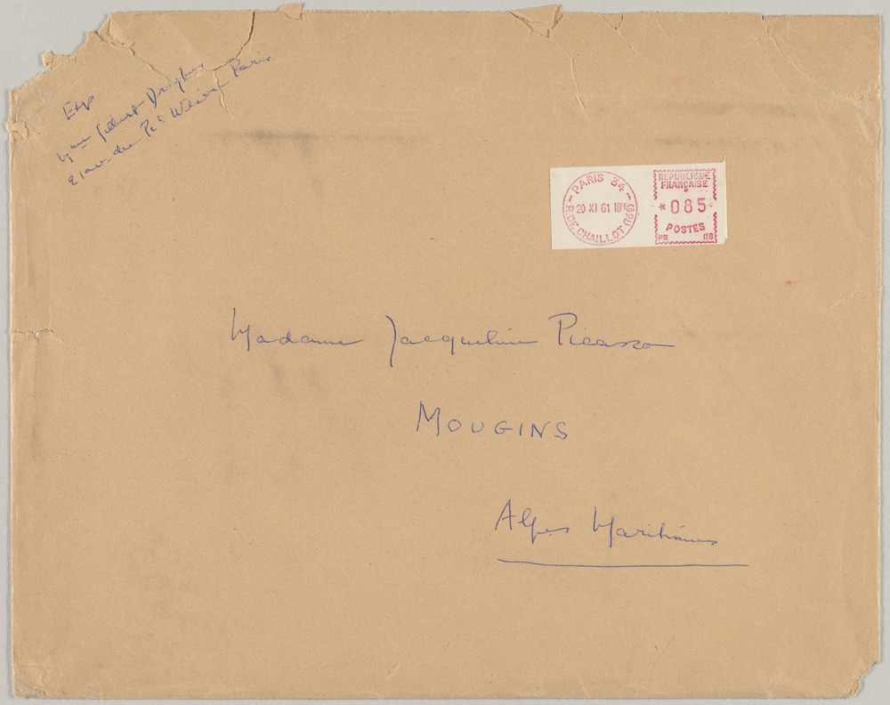 Enveloppe adressée à Jacqueline Roque avec des photographies de Jacques-Ernest Bulloz, novembre 1961