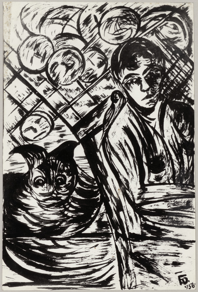 [Estampe "Personnage assis et chat"] de 1956 par Fodor