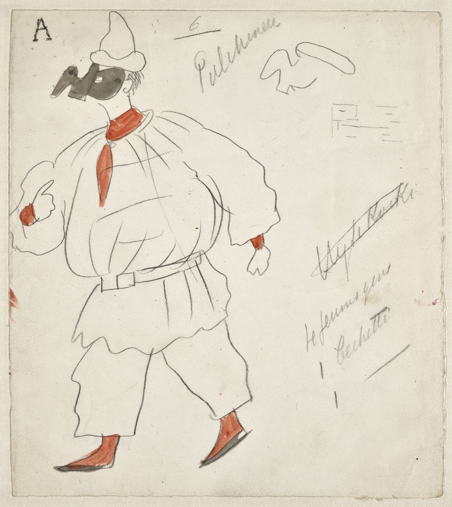 Étude pour le ballet Pulcinella: personnage de Pulcinella et annotations manuscrites