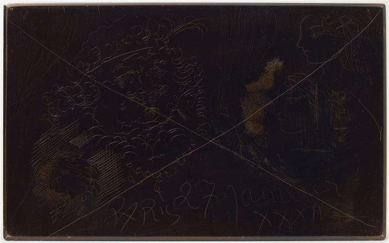 Eau forte sur cuivre. Plaque rayée et vernie