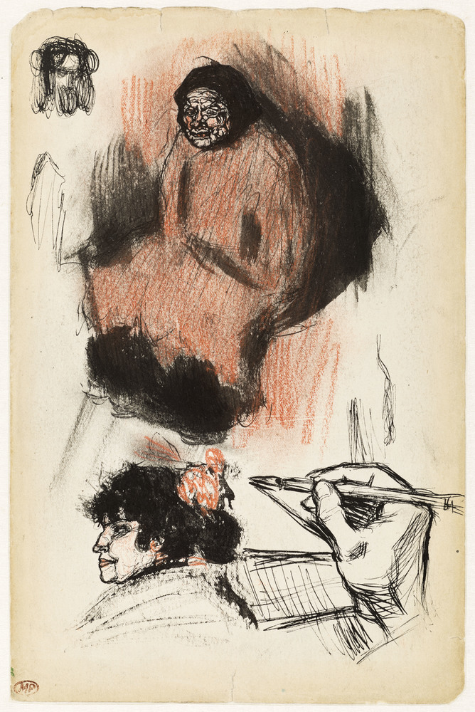 Études: tête de Christ, vieille femme assise, profil de femme et main tenant un pinceau