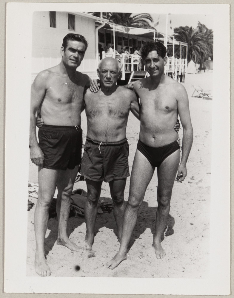 Eugenio Carmona, Pablo Picasso et Francisco Reina dit 'Minuni' sur la plage de Golfe-Juan, été 1954