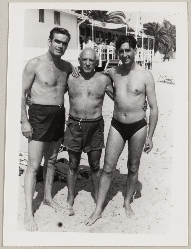 Eugenio Carmona, Pablo Picasso et Francisco Reina dit 'Minuni' sur la plage de Golfe-Juan, été 1954