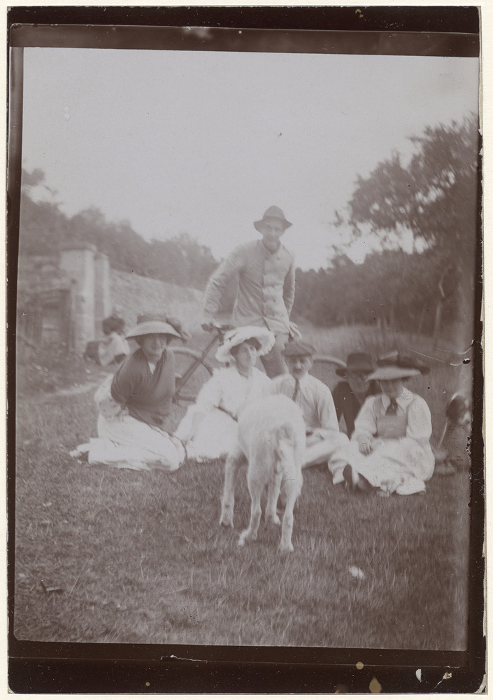 Eva Gouel avec Marcelle Braque, Max Jacob et des amis dans un pré et Frika, au premier plan, à Céret, en 1913