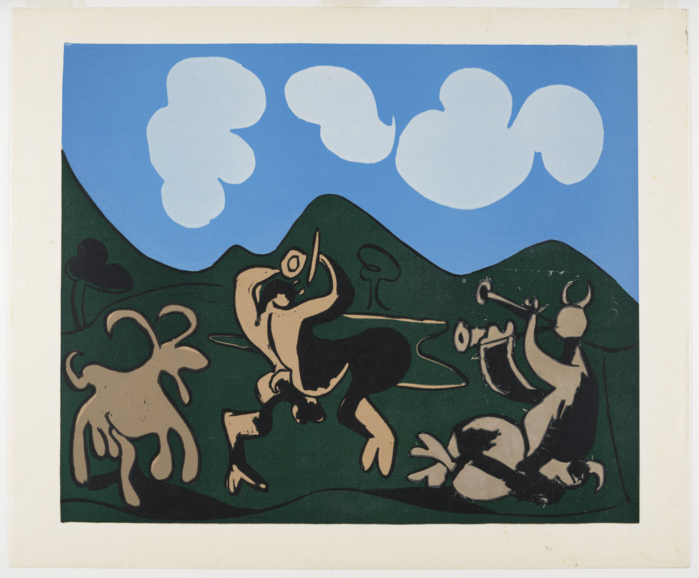 Linoleum gravé à la gouge. Premier plateau (ciel) Ier et IIème états, deuxième plateau (paysage) Ier, IIème et IIIème états, troisième plateau (chèvre) Ier état, quatrième plateau (faune flûtiste) Ier état. Épreuve tirée par Arnéra