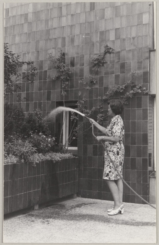 Femme arrosant son jardin sur terrasse, [vers 1970]