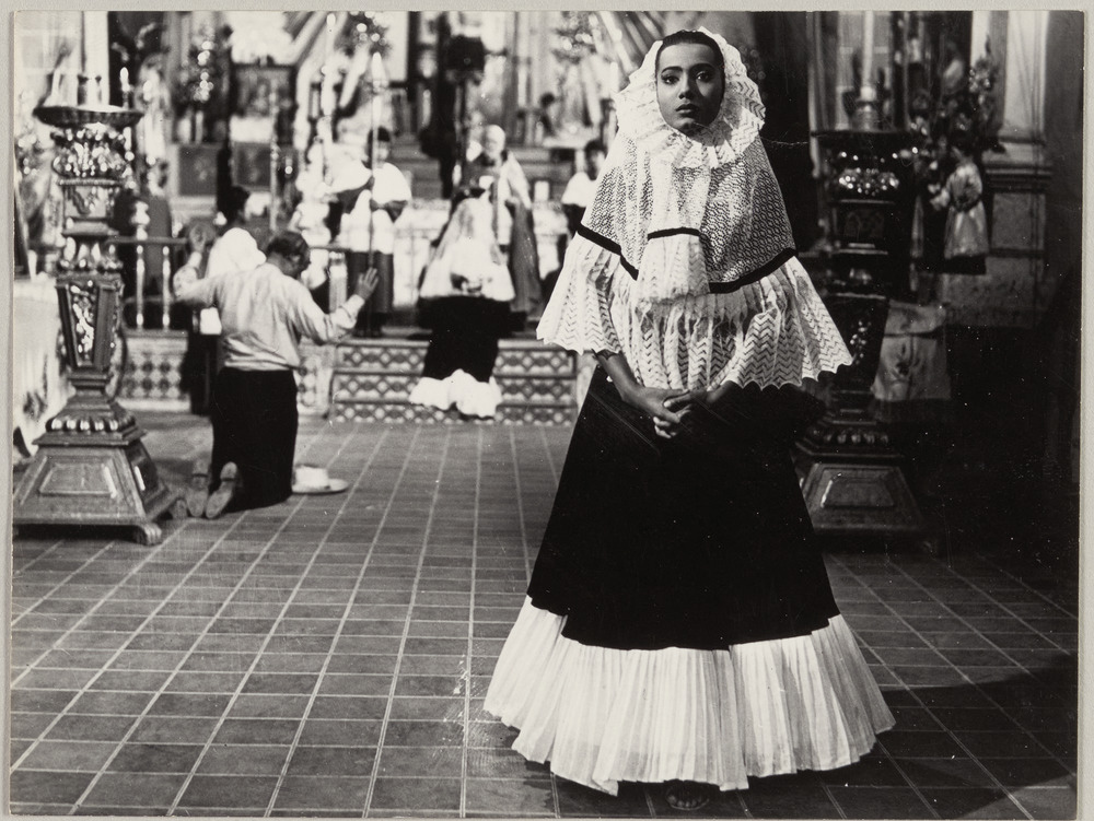 Femme en prière ; au second plan : officiants et pénitents, [tournage d'un film]