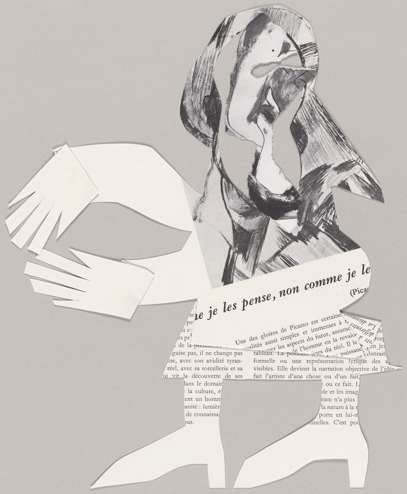 Papier faisant partie d'un ensemble de découpages et de déchirures réalisés à partir de photocopies de textes et de dessins de Pablo Picasso et mis en transparence sur papier photographique pour illustrer le "Désir attrapé par la queue", commande du professeur Jean Amiel